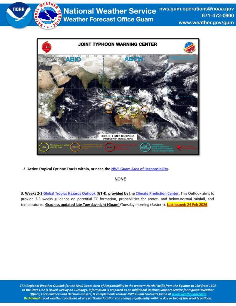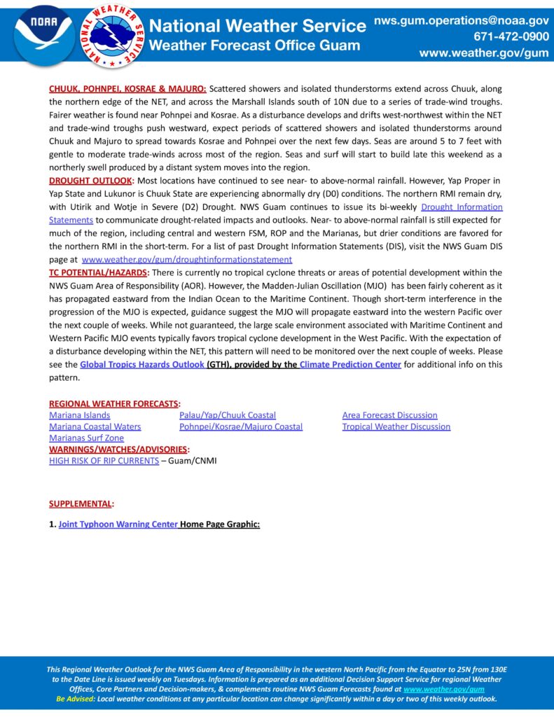 There are no tropical cyclone threats or areas of active development within the NWS Guam area of responsibility. However, forecasters are monitoring the Madden-Julian Oscillation, which is expected to propagate eastward into the western Pacific over the next couple of weeks. That pattern can favor tropical cyclone development in the West Pacific and will be watched in conjunction with the disturbance expected to form within the near-equatorial trough.