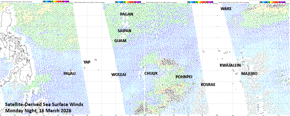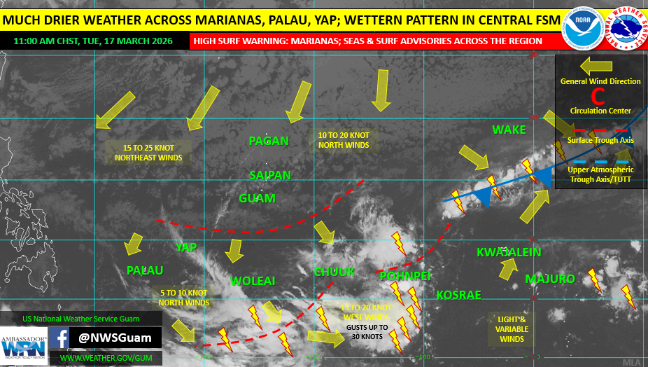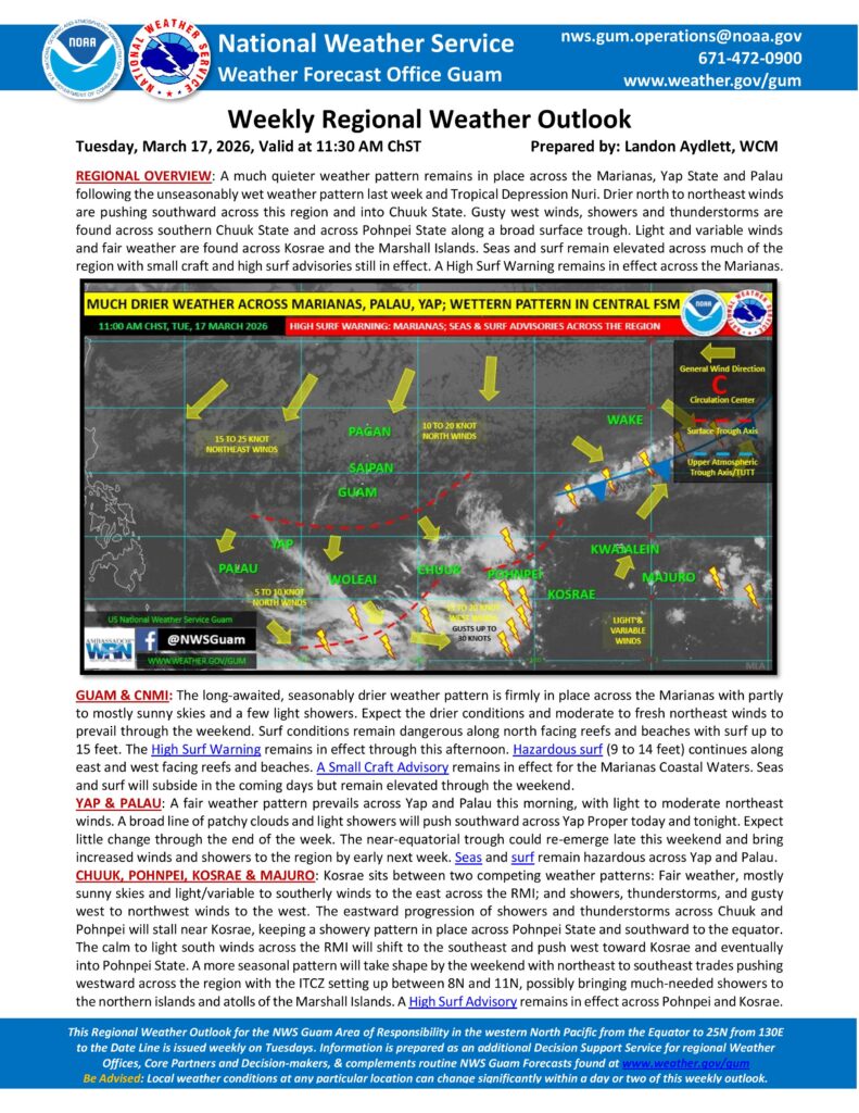 Despite the break in rainfall, dangerous surf conditions remain along north-facing reefs and beaches, where waves are reaching up to 15 feet. A High Surf Warning was in effect through Tuesday afternoon. Hazardous surf of 9 to 14 feet continues along east and west-facing reefs and beaches, and a Small Craft Advisory remains in effect for the Marianas Coastal Waters. Seas and surf are expected to subside in the coming days but will remain elevated through the weekend.