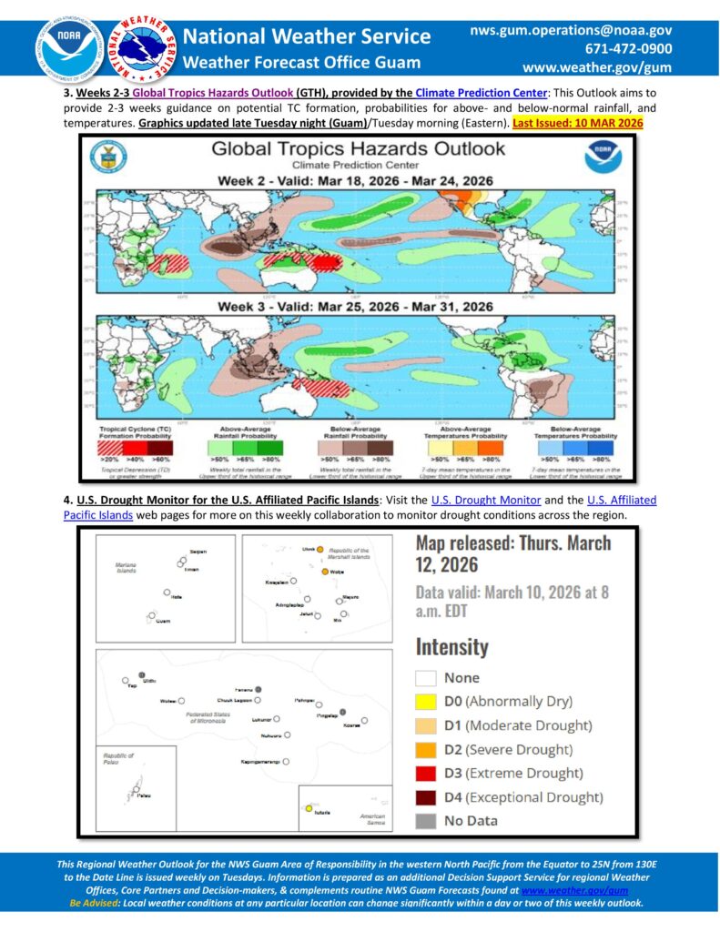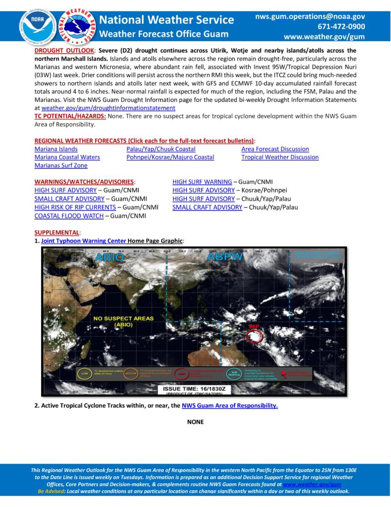 No tropical cyclone development is anticipated within the NWS Guam area of responsibility. The Marianas and western Micronesia remain drought-free, with abundant rainfall associated with last week’s Tropical Depression Nuri having alleviated any deficit in the region.
