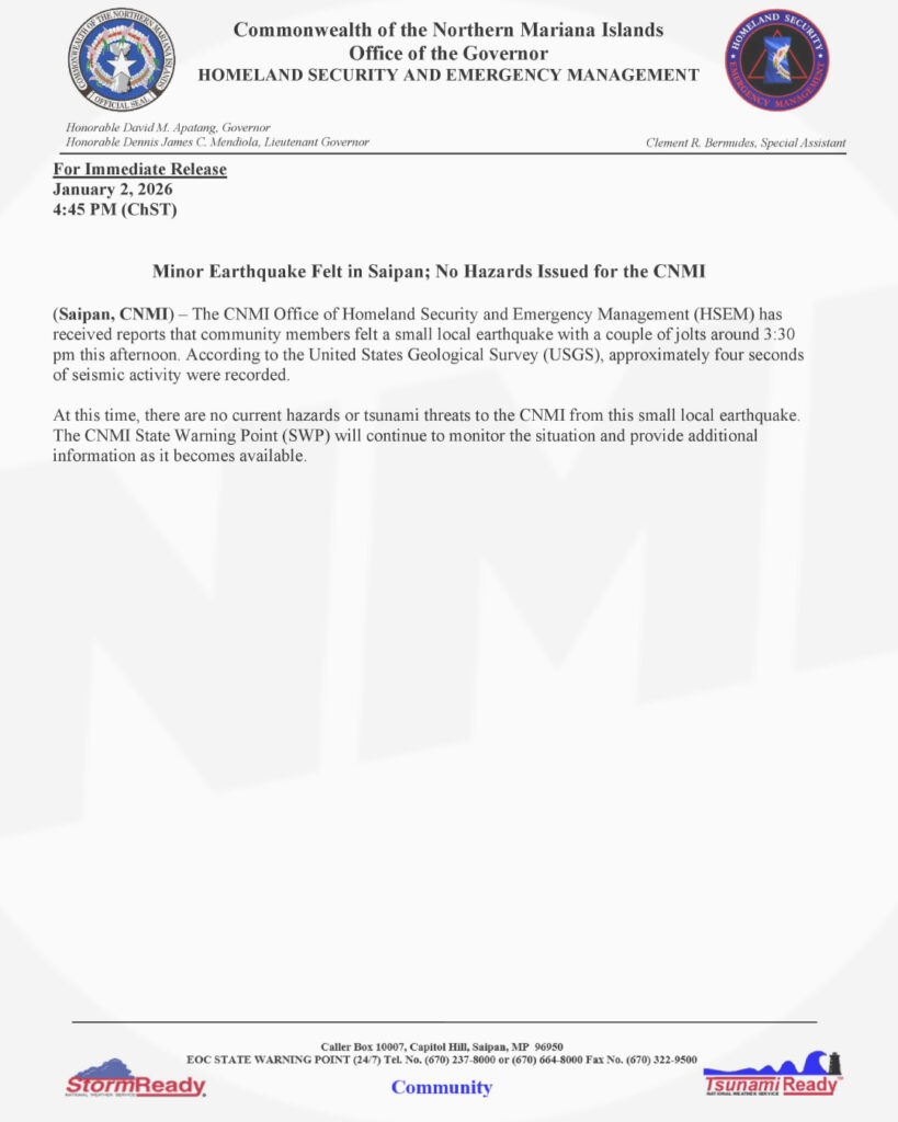 SAIPAN — The CNMI Office of Homeland Security and Emergency Management said community members reported feeling a small local earthquake with a couple of jolts around 3:30 p.m. Friday, and the U.S. Geological Survey recorded about four seconds of seismic activity. HSEM said no hazards or tsunami threats have been issued for the CNMI, and the CNMI State Warning Point will continue monitoring and provide updates as available.