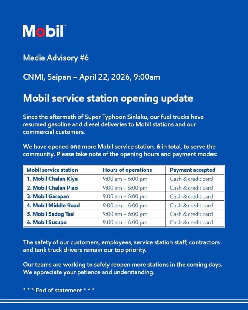 SAIPAN — Mobil has opened a sixth service station on Saipan, bringing the total number of operating locations to six as fuel truck deliveries of gasoline and diesel continue to Mobil stations and commercial customers following Typhoon Sinlaku.