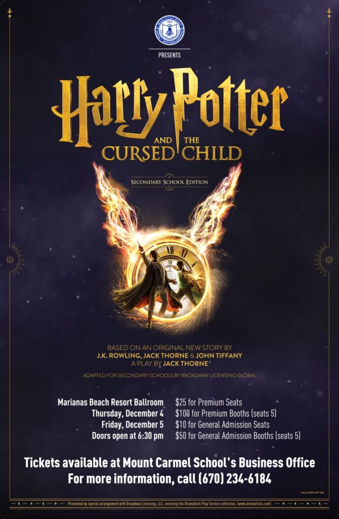 Performances of “Harry Potter and the Cursed Child” Secondary School Edition will be held on Thursday, December 4, and Friday, December 5, at the Marianas Beach Resort Ballroom. Tickets are $25 for premium seats, $100 for premium booths that seat five, $10 for general admission seats, and $50 for general admission booths that seat five. Doors open at 6:30 p.m., and tickets may be purchased at the Mount Carmel School Business Office. Due to limited seating, advanced ticket purchases are recommended.