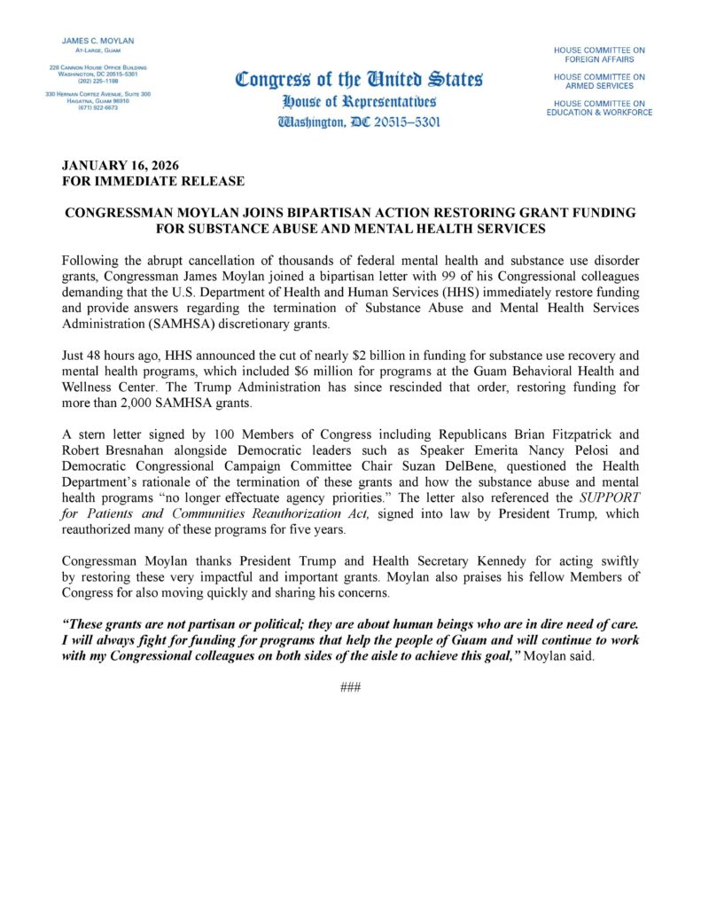 HAGATNA, Guam — Congressman James Moylan said he joined a bipartisan letter with 99 other members of Congress urging the U.S. Department of Health and Human Services to immediately restore funding and explain the termination of Substance Abuse and Mental Health Services Administration discretionary grants after what the release described as an abrupt wave of cancellations nationwide.