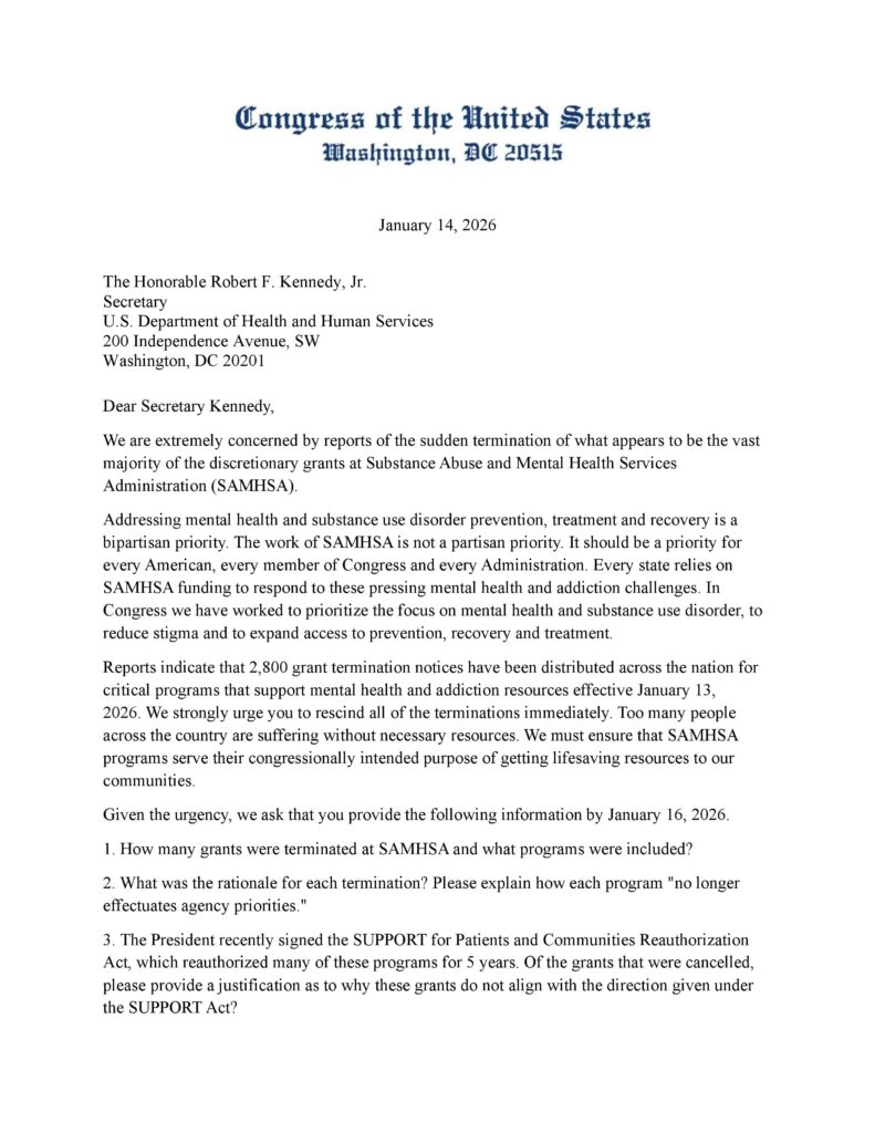 The letter to HHS Secretary Robert F. Kennedy Jr. questions the rationale for the terminations and references the SUPPORT for Patients and Communities Reauthorization Act, which it said reauthorized many of the programs for five years.