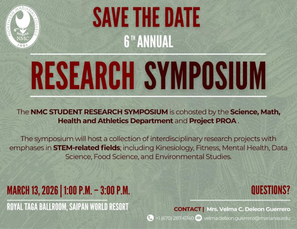 SAIPAN — Northern Marianas College will host its 6th Annual Research Symposium on Friday, March 13, from 1 to 3 p.m. at the Royal Taga Ballroom at Saipan World Resort.