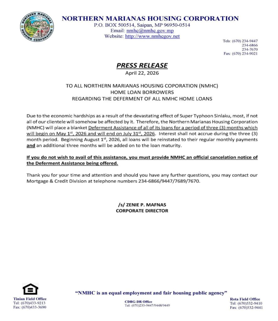 SAIPAN — The Northern Marianas Housing Corporation will defer all home loan payments for three months due to the economic hardships caused by Super Typhoon Sinlaku, Corporate Director Zenie P. Mafnas announced Wednesday.