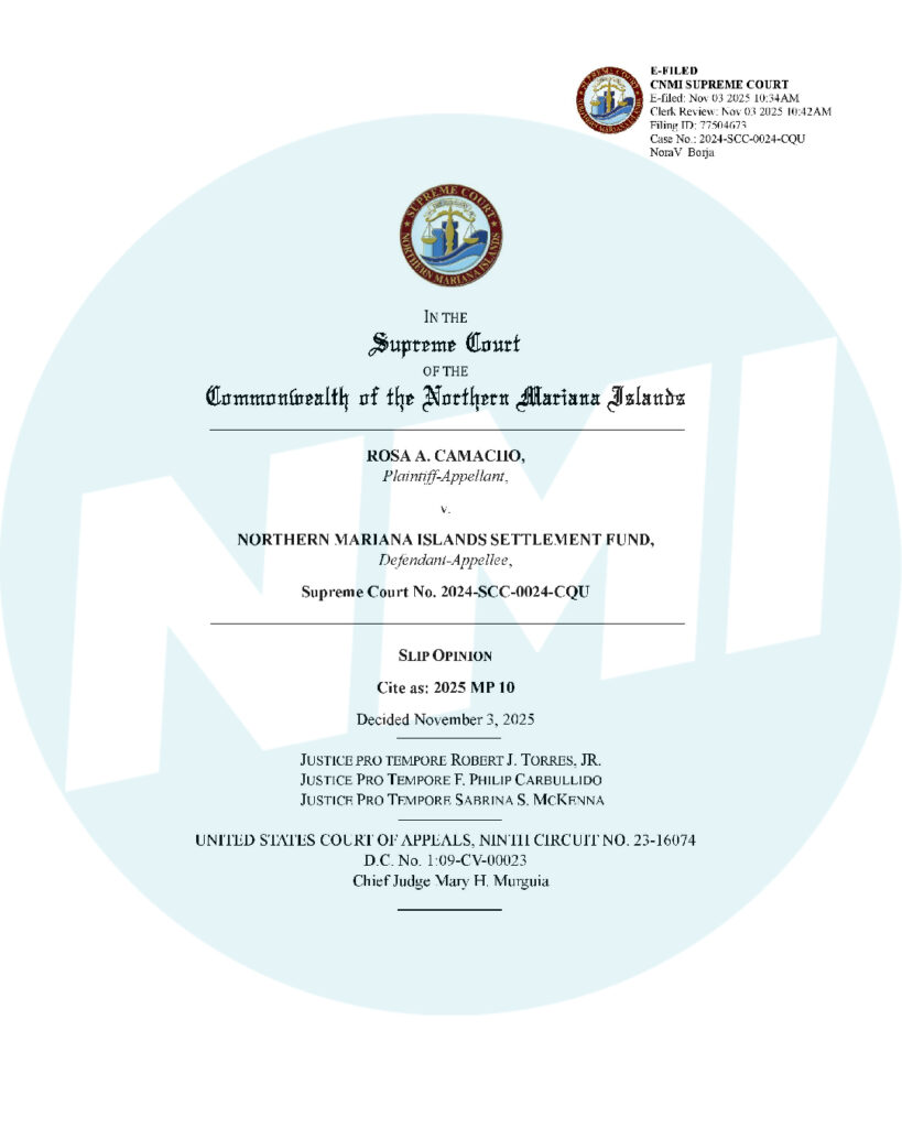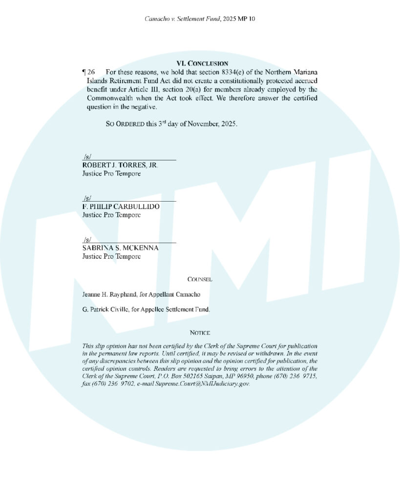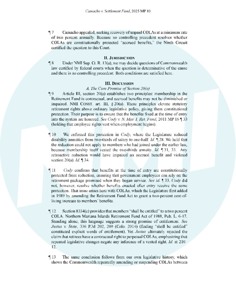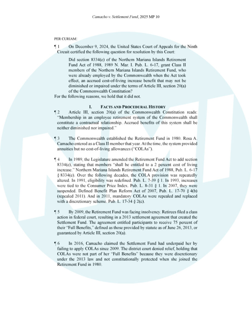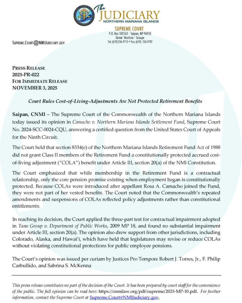 SAIPAN — Big ruling out today: the NMI Supreme Court answered a Ninth Circuit certified question and said cost-of-living adjustments (COLAs) are not constitutionally protected retirement benefits for Class II members of the former Retirement Fund.