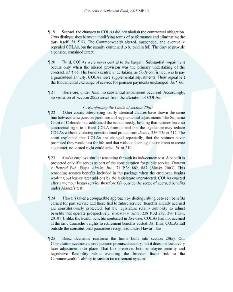 Applying the Tano Group three-part test, the Court found no substantial impairment under Article III, section 20(a). It also noted other states—Colorado, Alaska, Hawaiʻi—let legislatures revise or reduce COLAs without violating pension protections.