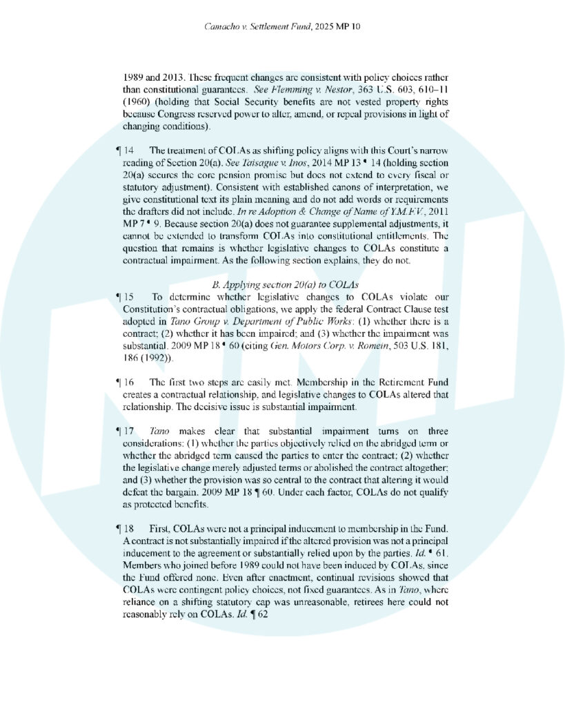 The justices said membership in the Fund is a contract, but only the core pension promise from when you started work is protected. Because appellant Rosa A. Camacho joined before COLAs existed, they weren’t part of her vested benefits. Lawmakers’ on-again, off-again COLA changes were policy calls—not constitutional entitlements.
