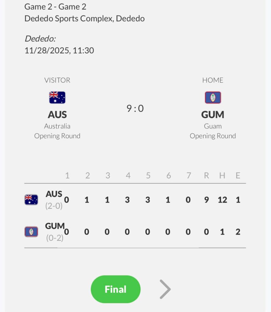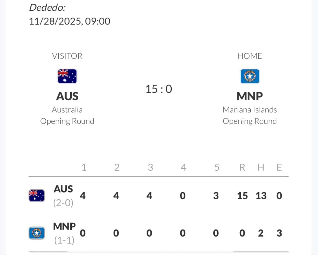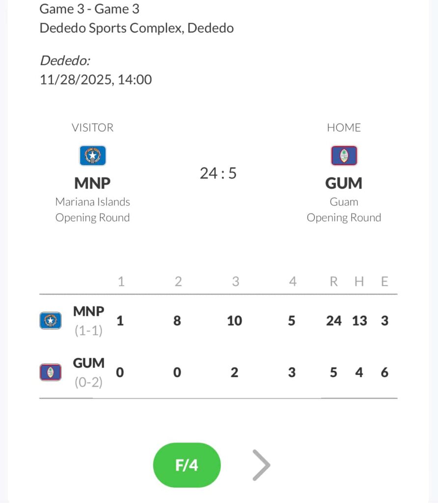Back in the afternoon, after scoring once in the first against Guam, NMI broke the game open with eight runs in the second and 10 more in the third, then added five in the fourth to end it early. Guam got on the board with two runs in the third and added three more in the fourth, but the outcome was largely decided by NMI’s middle-innings surge.