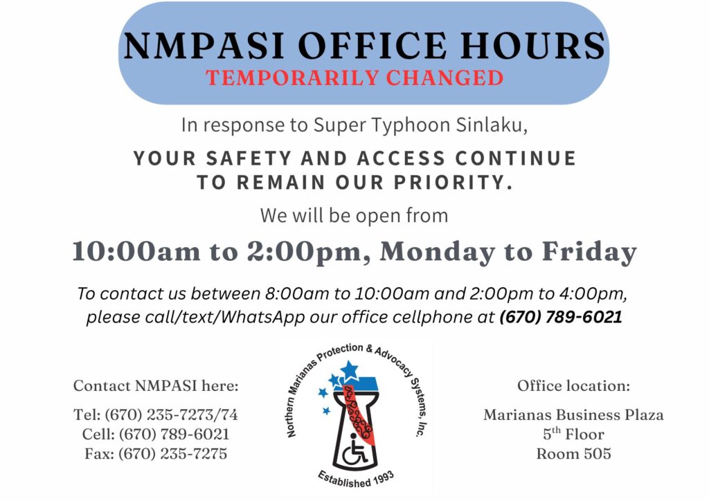 SAIPAN — The Northern Marianas Protection and Advocacy Systems, Inc. has temporarily adjusted its office hours in response to Super Typhoon Sinlaku, with in-person services now available from 10:00 a.m. to 2:00 p.m., Monday through Friday.