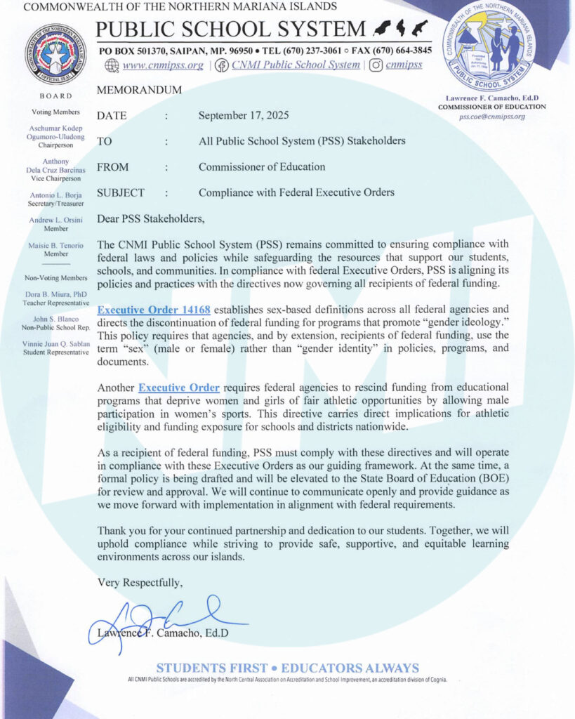 In a memo issued this week, PSS Commissioner of Education Lawrence F. Camacho said the system is aligning policies and practices with the directives, noting that non-compliance could put federal funding at risk.
