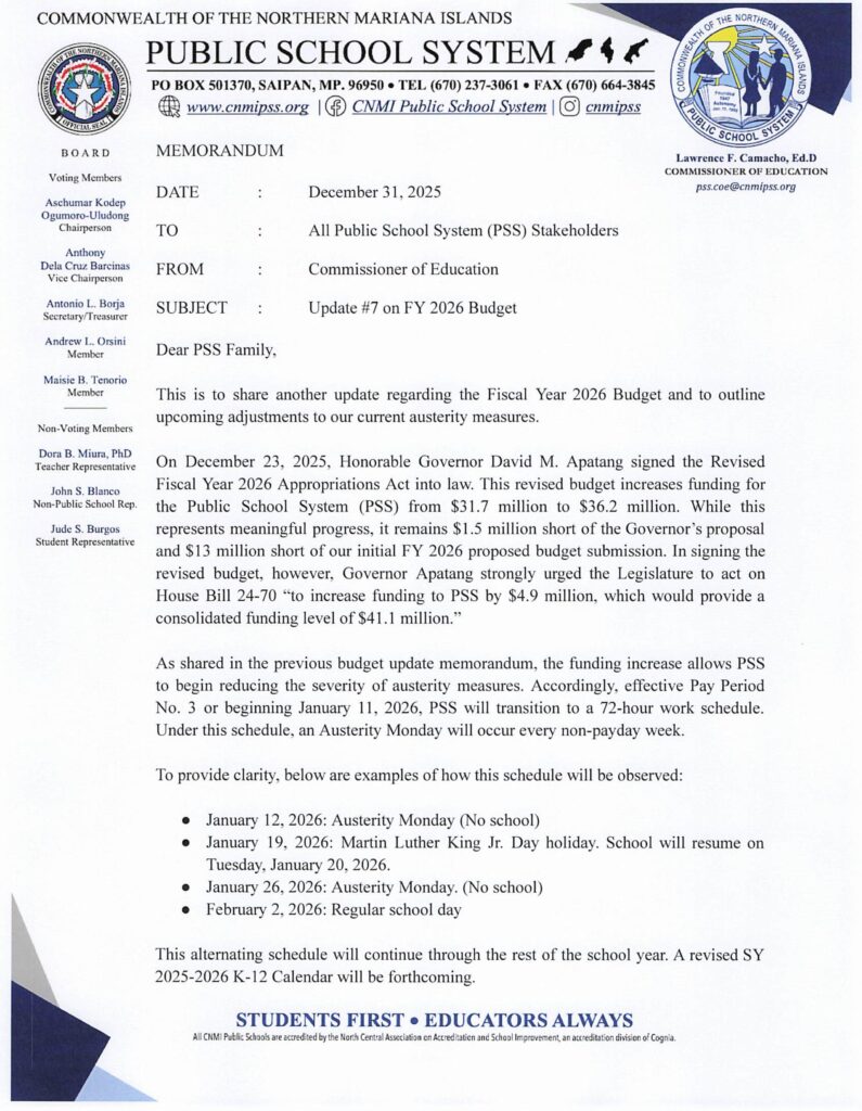 On December 23, Governor Apatang signed the Revised Fiscal Year 2026 Appropriations Act into law, increasing PSS funding from $31.7 million to $36.2 million. However, the revised budget remains $1.5 million short of the Governor’s proposal and $13 million short of PSS’s initial FY 2026 proposed budget submission.