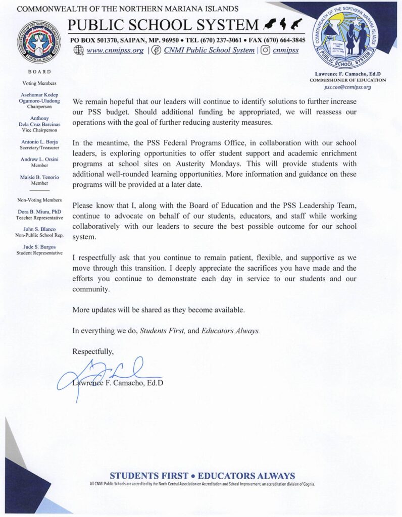 The CNMI Public School System will transition to a reduced austerity schedule beginning in January following a budget increase signed into law by Governor David M. Apatang, according to a memorandum released by Commissioner of Education Lawrence F. Camacho.
