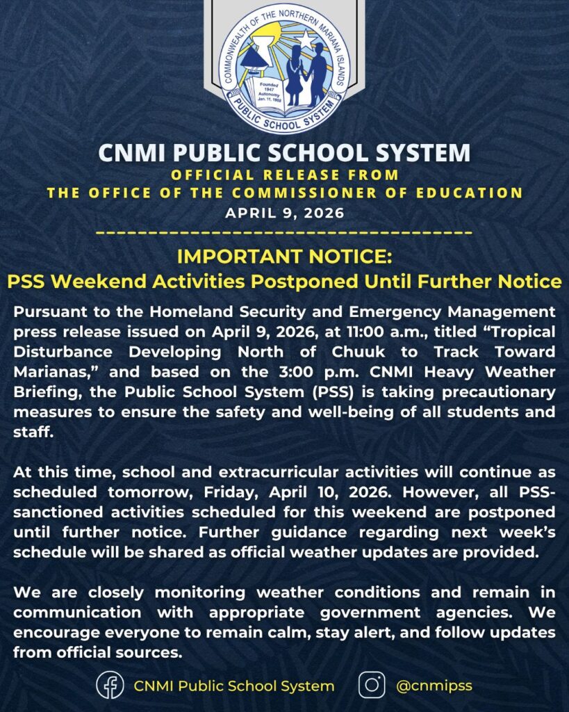 SAIPAN — The CNMI Public School System has postponed all PSS-sanctioned weekend activities until further notice, citing the approaching tropical disturbance Invest 90W and a heavy weather briefing held Thursday afternoon.