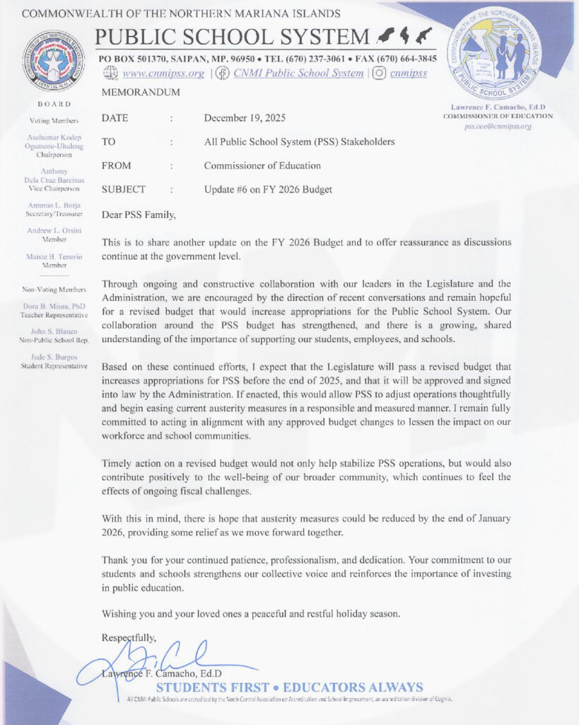 In his December 19 memorandum titled “Update #6 on FY 2026 Budget,” Camacho said PSS leaders have continued working with leaders in the Legislature and the administration and remain hopeful recent conversations will lead to a revised budget that increases funding for the school system.