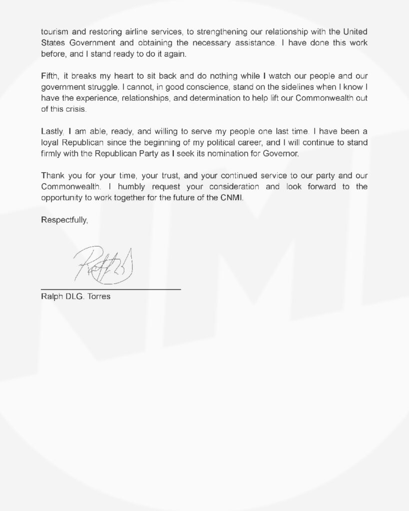 Republican Party President Patrick Cepeda confirmed to NMI News Service that the party has received Torres’ letter and said the GOP will issue a formal press release regarding the submission.