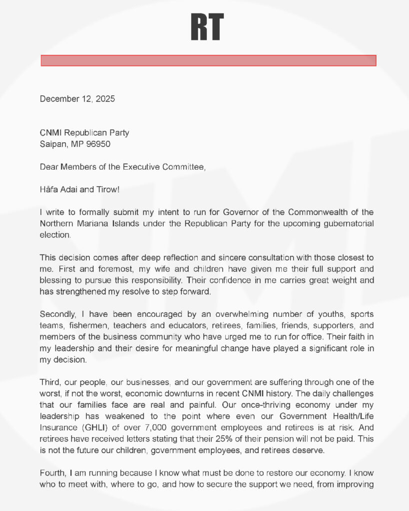 SAIPAN — Former CNMI Governor Ralph Deleon Guerrero Torres has formally notified the CNMI Republican Party that he intends to seek the GOP nomination for governor in the next gubernatorial election, citing the territory’s economic troubles and growing anxiety among retirees and government workers.