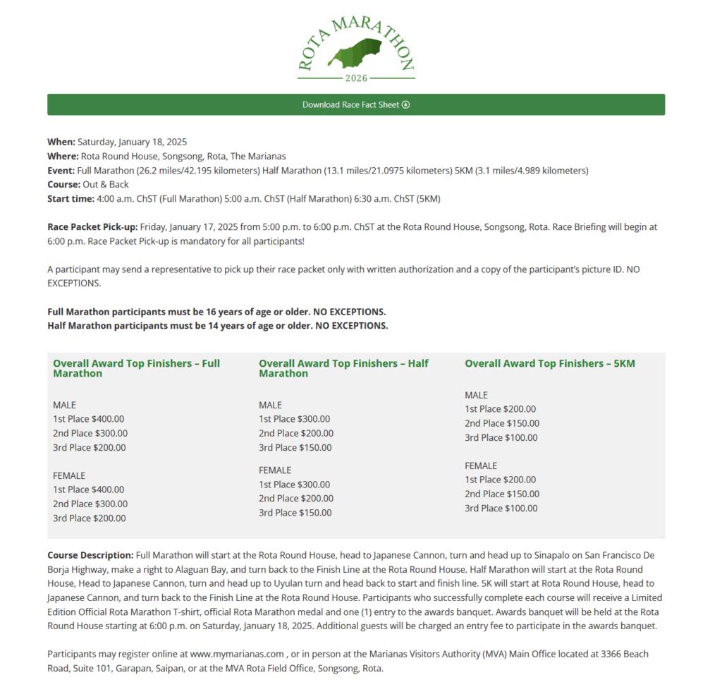 The action starts on January 31, 2026 with a full marathon, half marathon, and 5K course co-organized by the Marianas Visitors Authority and the Office of the Mayor of Rota. Registration can be completed online by downloading a form from The Marianas Calendar at mymarianas.com and emailing it to MVA, or in person at MVA offices on Saipan and Rota.