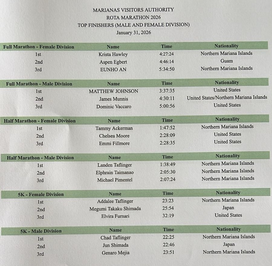 Rota — Two weeks after conquering the inaugural Saipan Sugarcane Railroad Journey 81km Run, Saipan’s Krista Hawley was the first female to finish the 2026 Rota Marathon with a time of 4:27:24, while Matthew Johnson claimed first place overall with a time of 3:37:35 .