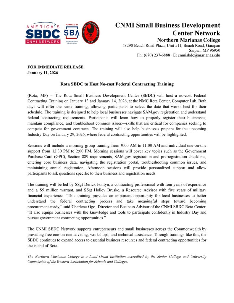 ROTA — The Rota Small Business Development Center will host a no-cost Federal Contracting Training on January 13-14 at the Northern Marianas College Rota Center Computer Lab, with identical sessions offered both days.