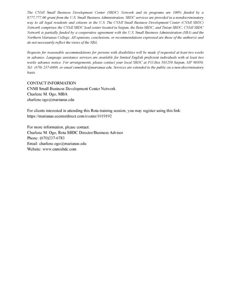 Charlene Ogo, director and business advisor for the CNMI SBDC Rota Center, said the training is intended to help businesses become “procurement-ready” and participate confidently in Industry Day.