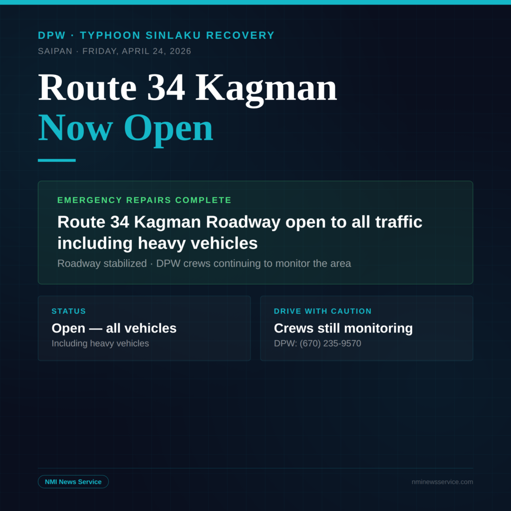 SAIPAN — The Department of Public Works has completed emergency road repairs on the affected section of Route 34 in Kagman and the roadway is now open to all traffic, including heavy vehicles, as of Friday, April 24.