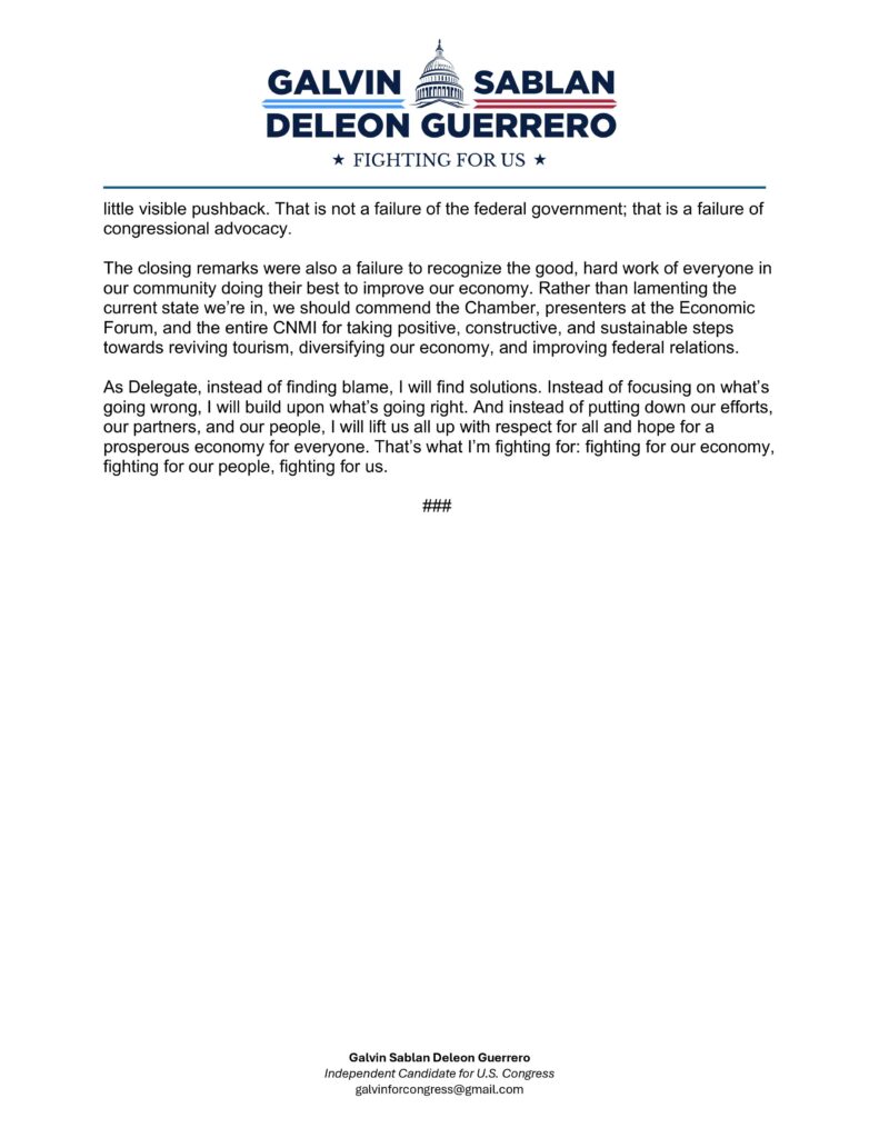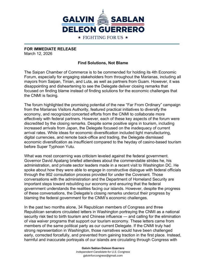 The Saipan Chamber of Commerce is to be commended for holding its 4th Economic Forum, especially for engaging stakeholders from throughout the Marianas, including all mayors from Saipan, Tinian, and Luta, as well as partners from Guam. However, it was disappointing and disheartening to see the Delegate deliver closing remarks that focused on finding blame instead of finding solutions for the economic challenges that the CNMI is facing.