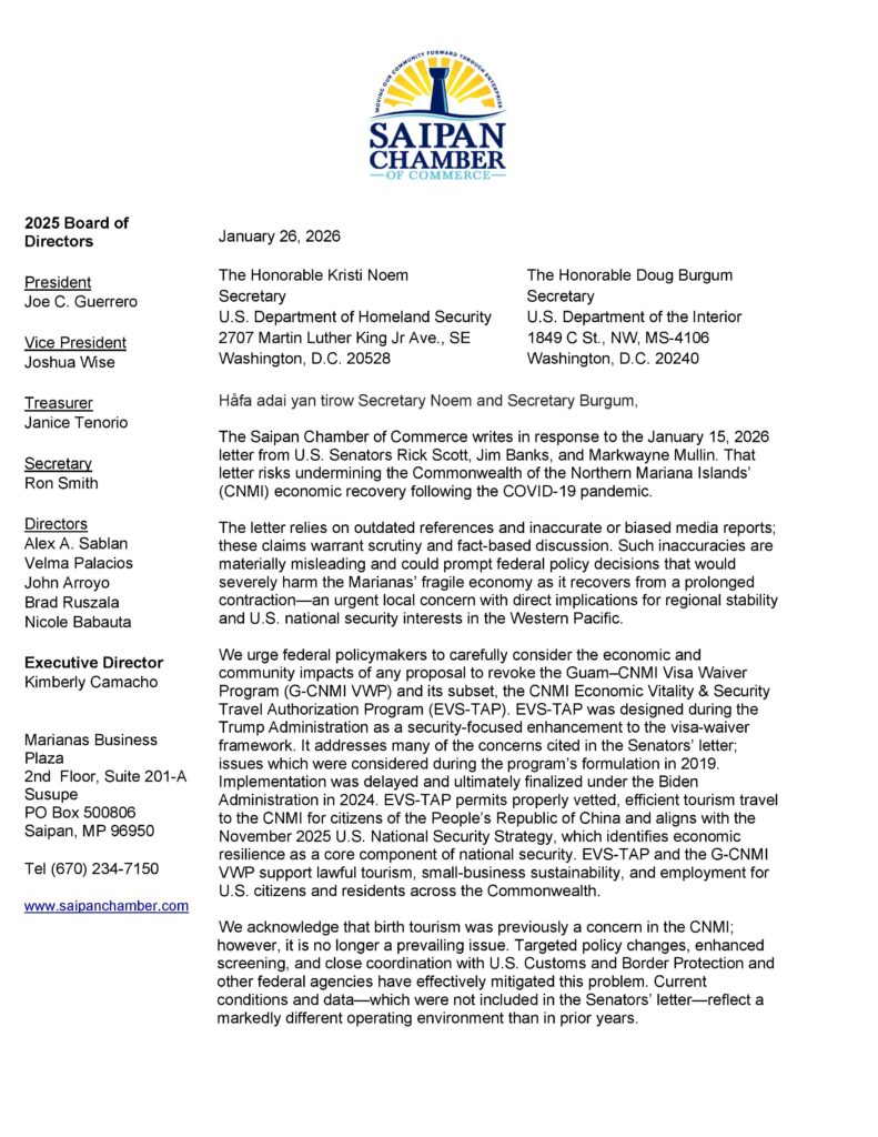 SAIPAN — The Saipan Chamber of Commerce is urging Homeland Security Secretary Kristi Noem and Interior Secretary Doug Burgum to carefully consider the economic and community consequences of any changes to CNMI travel programs, arguing that the letter from three U.S. senators relies on outdated references and “materially misleading” claims.