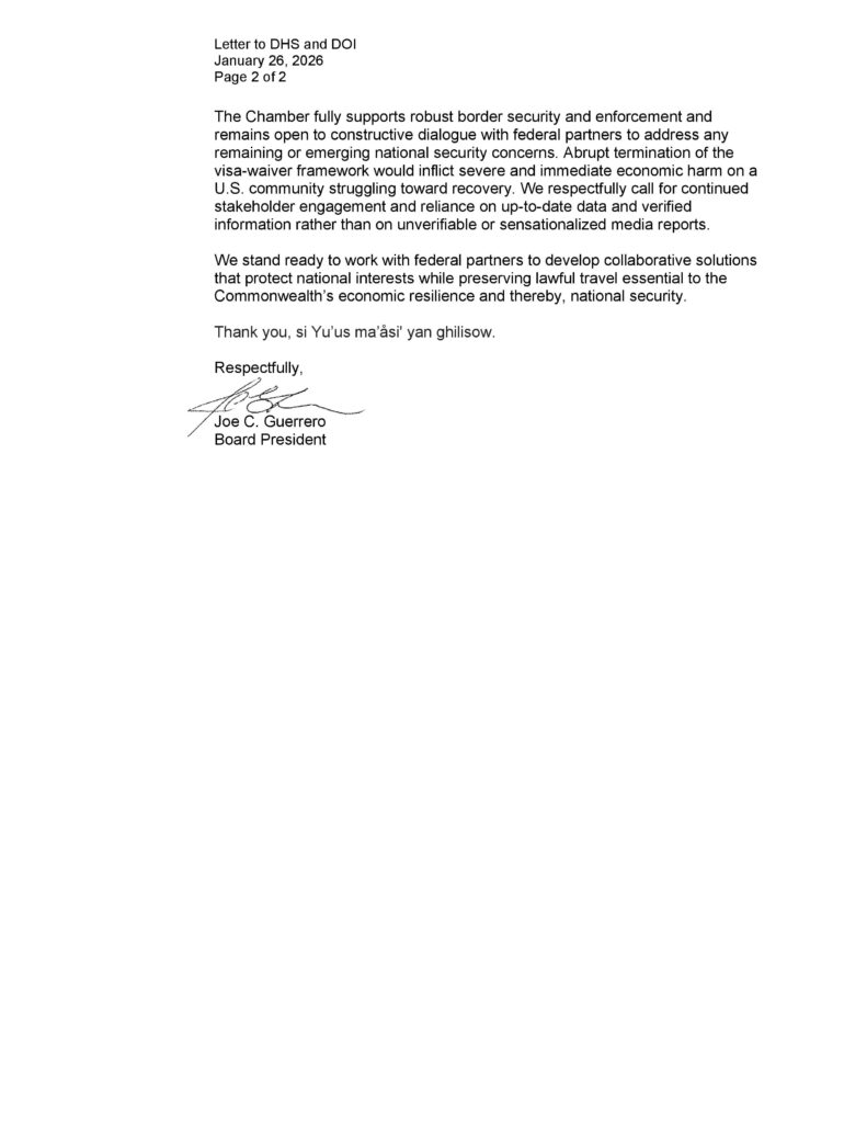 The Chamber specifically urged federal policymakers to weigh the impacts of any proposal to revoke the Guam–CNMI Visa Waiver Program and its subset, the CNMI Economic Vitality & Security Travel Authorization Program (EVS-TAP). The letter says EVS-TAP was designed during the first Trump Administration as a security-focused enhancement to the visa waiver framework, with issues raised in the senators’ letter having been considered during the program’s formulation in 2019, and that implementation was delayed and ultimately finalized under the Biden Administration in 2024.