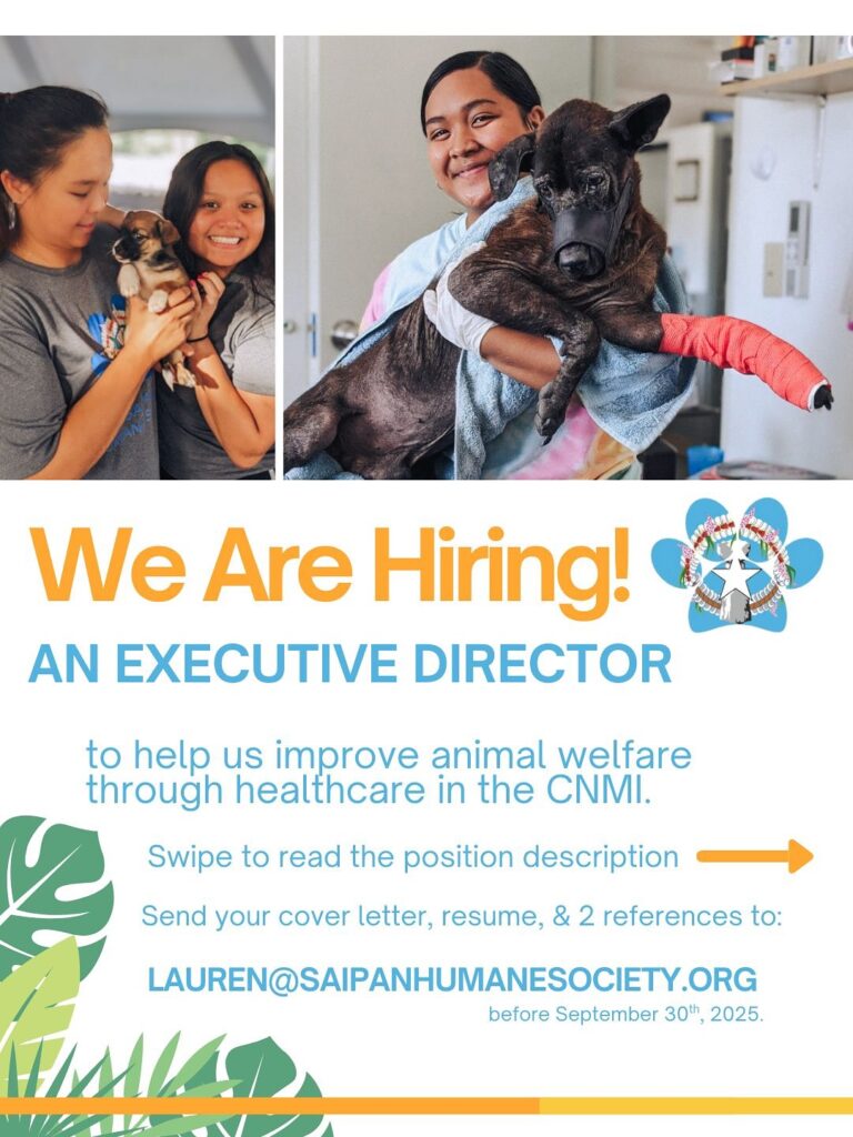 SAIPAN – The Saipan Humane Society (SHS) is hiring a full-time Executive Director to oversee operations, finances, donor relations, volunteers, and programs as the nonprofit continues its animal-health mission in a community with no resident veterinarian.