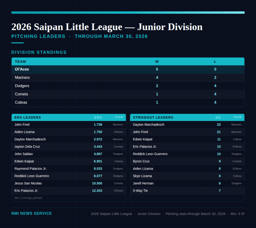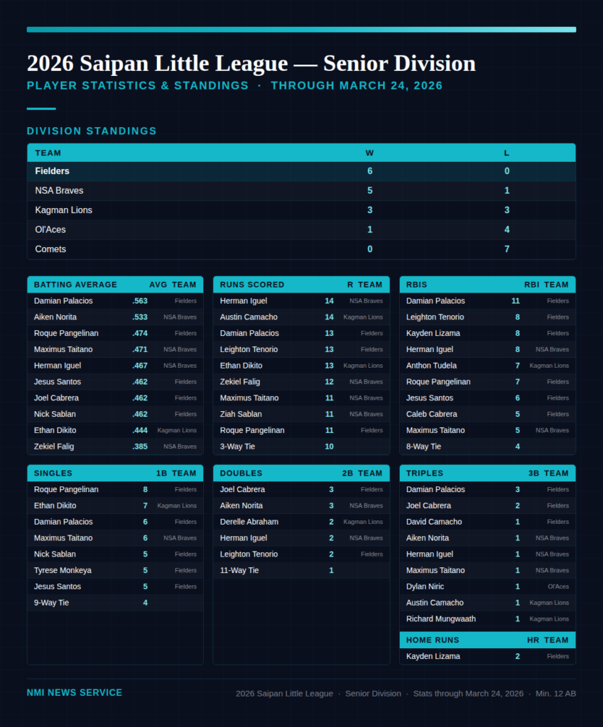 SAIPAN — After weeks of weather-related disruptions that left fields waterlogged and schedules in flux, the 2026 Saipan Little League season is hitting its stride, with the Senior and Junior divisions both producing standout individual performances and clear frontrunners in the standings.