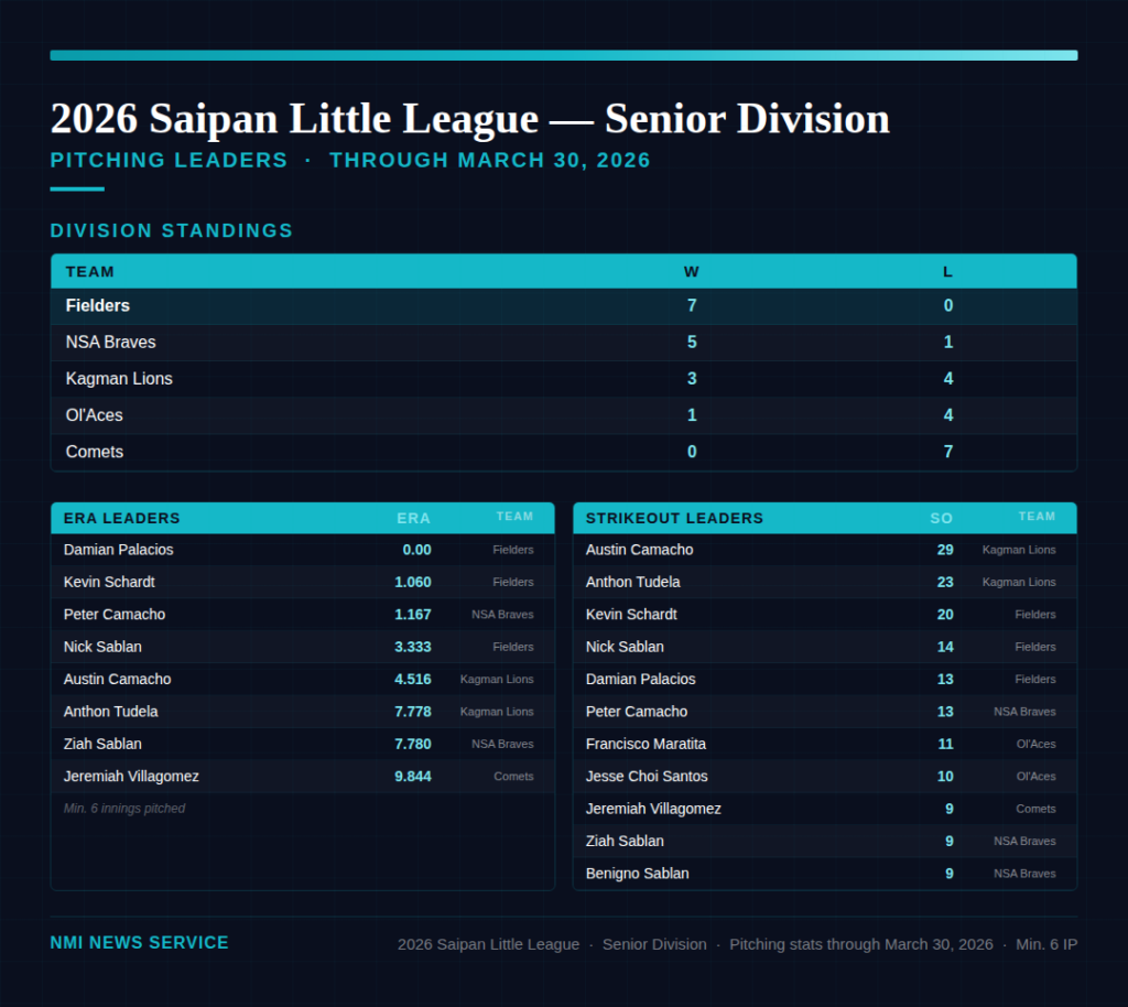 In the Senior Division, the Fielders have been dominant, posting a perfect 7-0 record through March 30. On the mound, Damian Palacios has been virtually unhittable, throwing 11 innings without allowing an earned run for a 0.00 ERA. At the plate, Palacios is also the division’s top hitter at .563 with 11 RBIs, making him the most complete two-way player in the league. The NSA Braves are the only team within striking distance at 5-1, while the Kagman Lions sit at 3-4, the Ol’Aces at 1-4 and the Comets winless at 0-7.