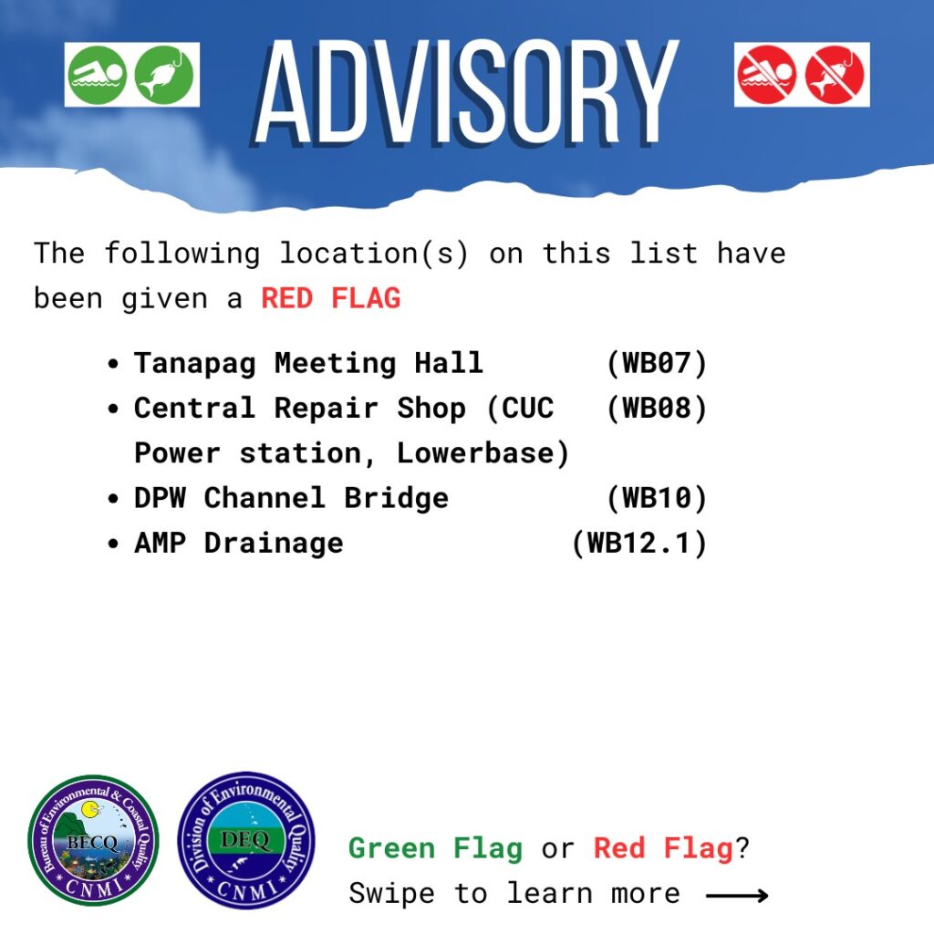 According to the advisory, samples collected from several sites showed excessive concentrations of fecal indicator bacteria (enterococci) that exceeded CNMI Marine Water Quality Standards. Red-flag status indicates the possible presence of human or animal waste in the water and means the locations are not safe for swimming or fishing.