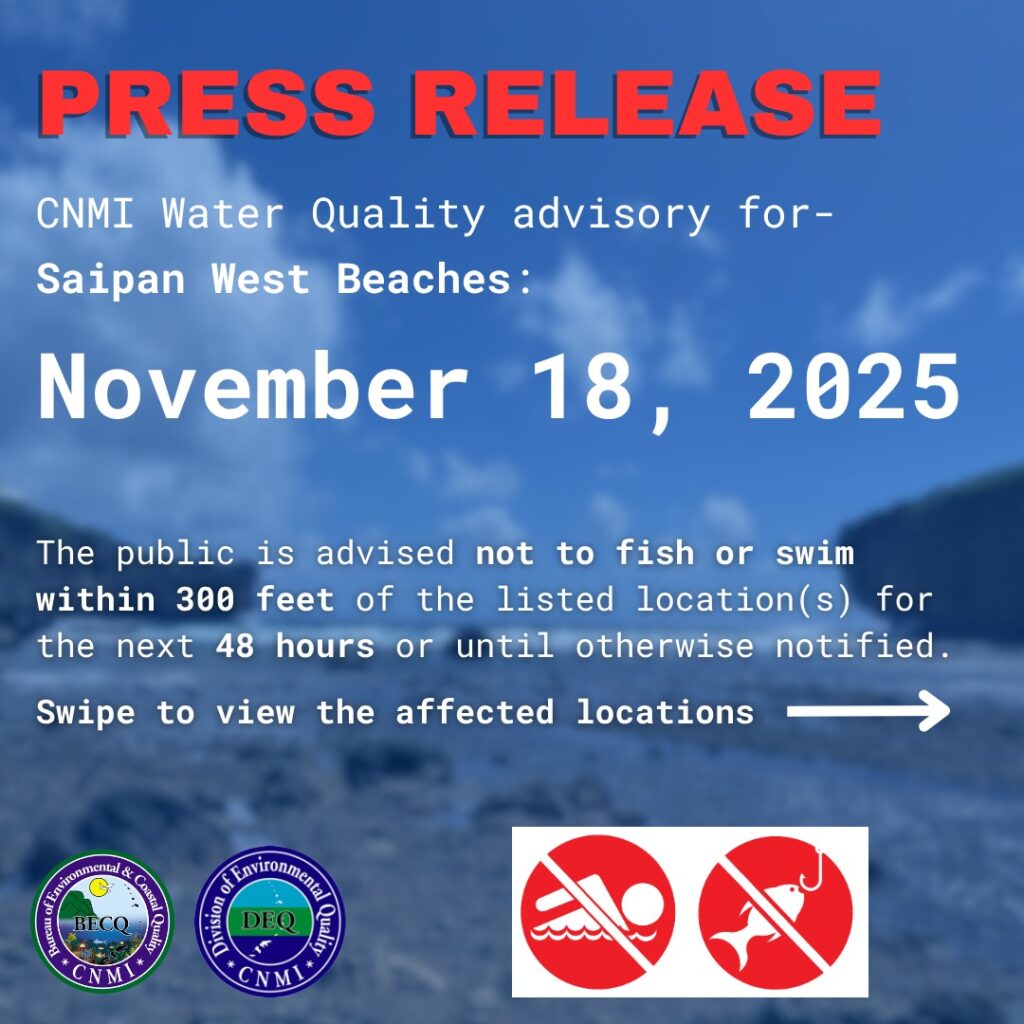 SAIPAN — The Bureau of Environmental and Coastal Quality and the Division of Environmental Quality have issued a red-flag water quality advisory for multiple locations along Saipan’s west beaches as of November 18, 2025.