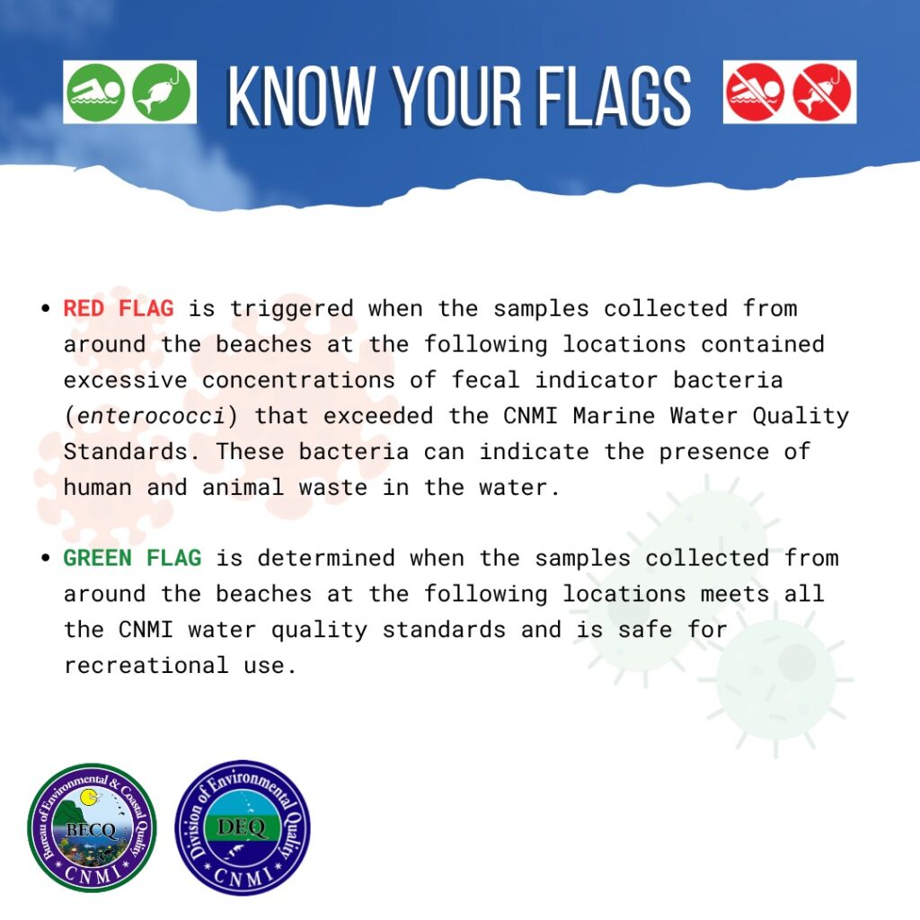 Green-flag locations remain safe for recreational use, as those sample results meet all CNMI water quality standards.