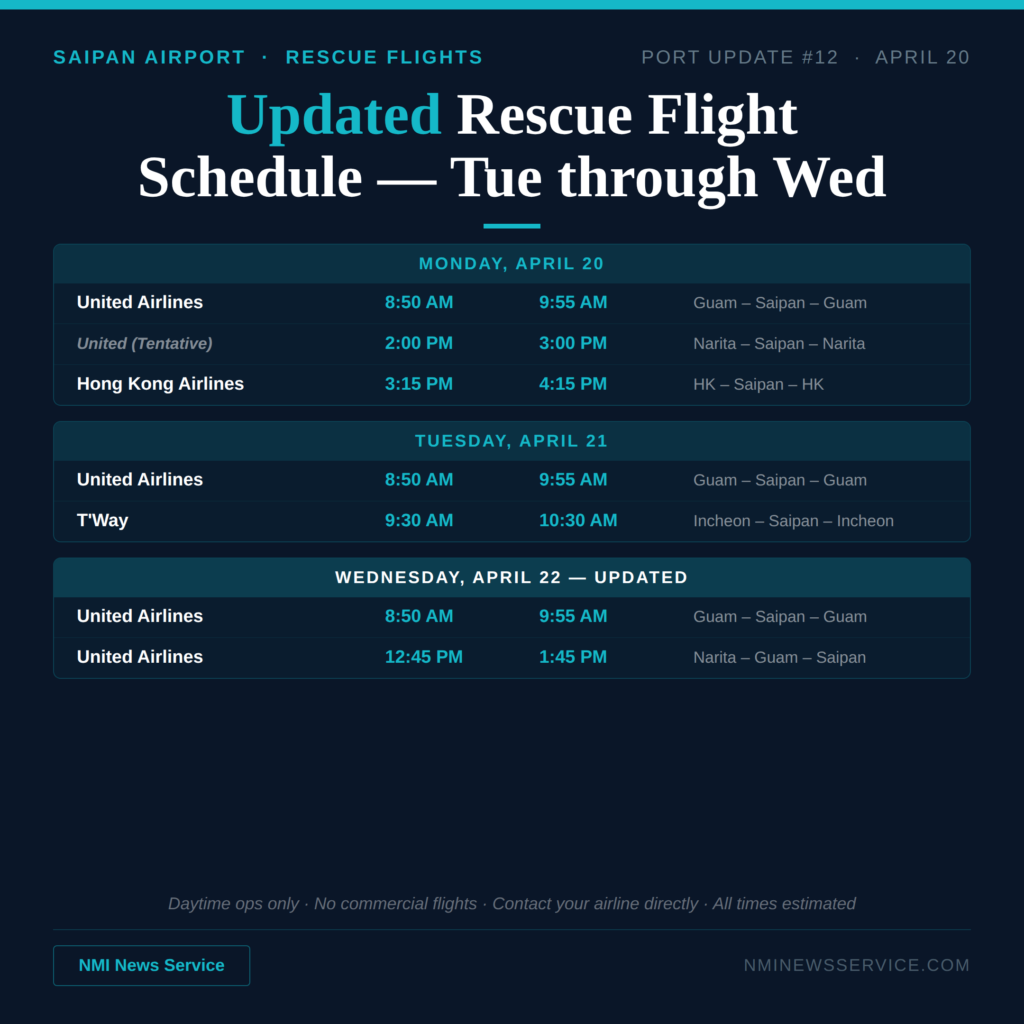 SAIPAN — The Commonwealth Ports Authority issued an updated rescue flight schedule Monday evening, with Wednesday gaining a second United Airlines flight and Philippine Airlines and T’Way removed from Monday’s lineup.
