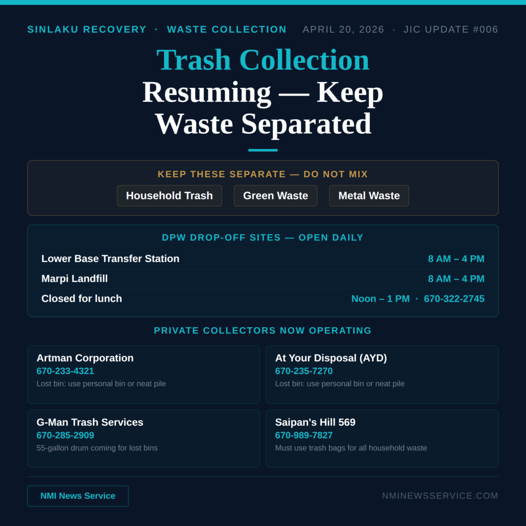 SAIPAN — All four private trash collection companies on Saipan have resumed service following Typhoon Sinlaku, with officials urging residents to keep household trash, green waste and metal waste strictly separated when disposing of storm debris.