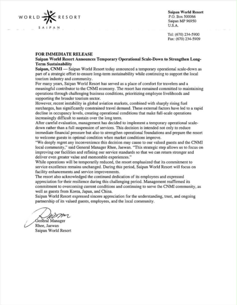 “We deeply regret any inconvenience this decision may cause to our valued guests and the CNMI local community,” General Manager Jaewan Rhee said. “This strategic step allows us to focus on improving our facilities and refining our service standards so that we can return stronger and deliver even greater value and memorable experiences.”