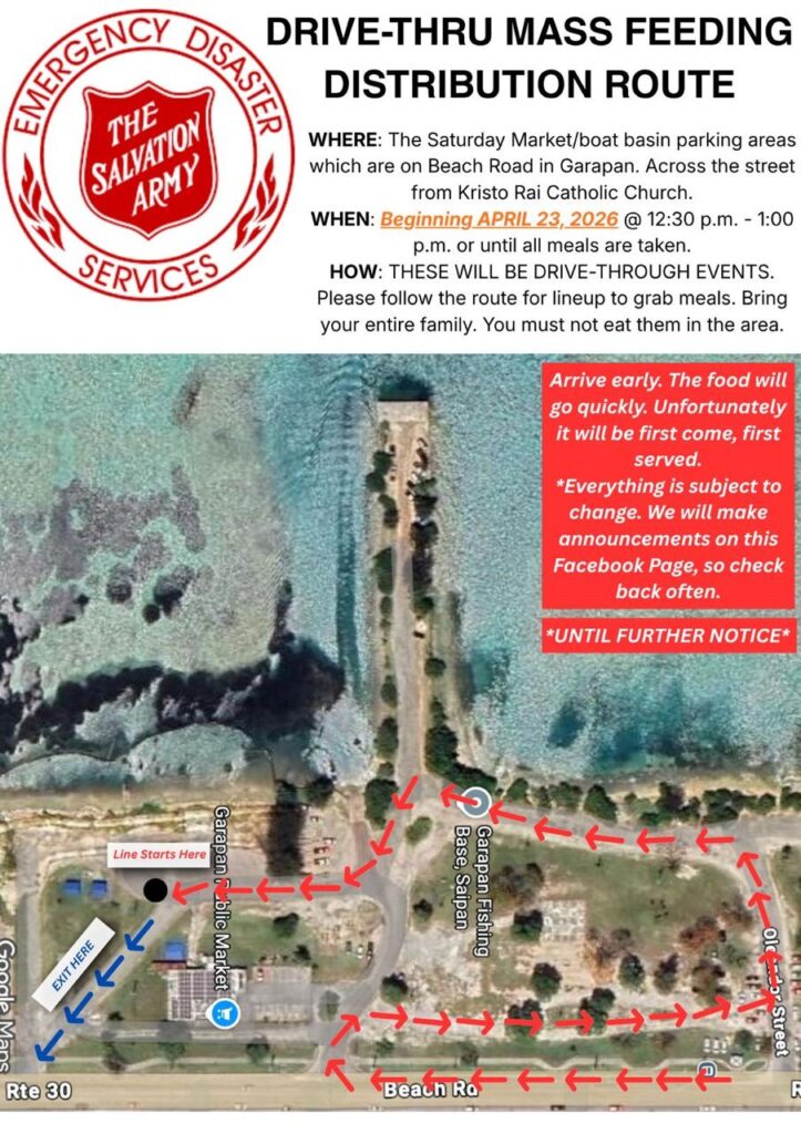SAIPAN — The Salvation Army Emergency Disaster Services is launching a drive-thru mass feeding distribution beginning today from 12:30 p.m. to 1:00 p.m., or until all meals are taken, at the Saturday Market and boat basin parking areas on Beach Road in Garapan, across from Kristo Rai Catholic Church.