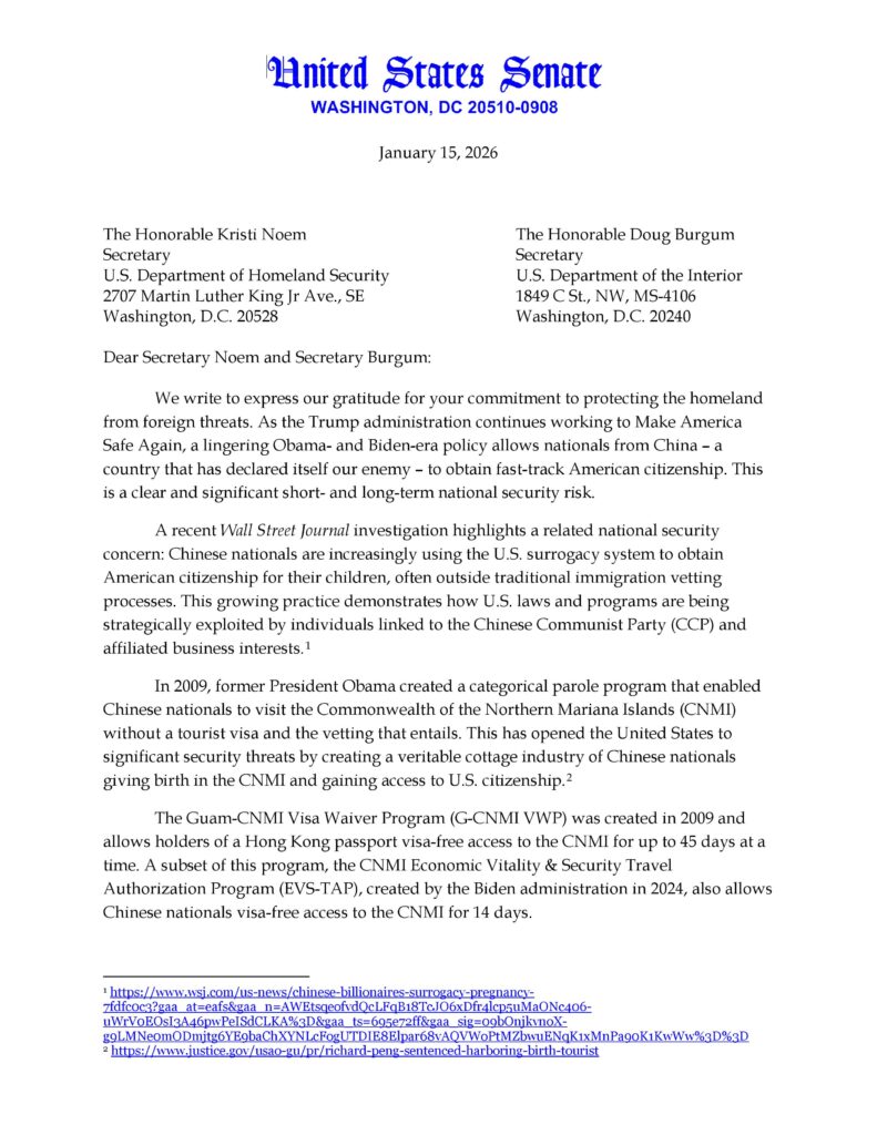 WASHINGTON, D.C. — Three U.S. senators are pressing the Department of Homeland Security to revoke a Biden-era CNMI travel authorization that allows visa-free entry for Chinese nationals, arguing the policy has fueled birth tourism in Saipan and created what they describe as a national security vulnerability.