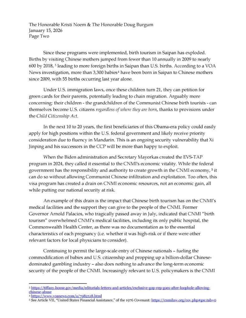 The letter claims birth tourism in Saipan “exploded” after the programs were implemented, citing figures that births by visiting Chinese mothers rose from fewer than 10 annually in 2009 to nearly 600 by 2018, and that more than 3,300 babies have been born in Saipan to Chinese mothers since 2009.