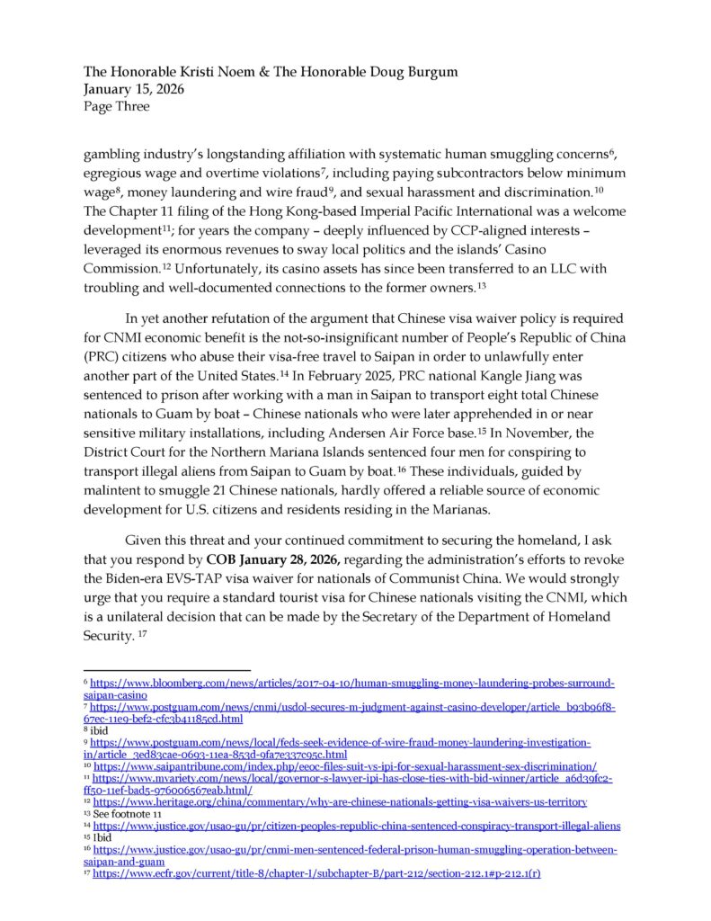 The senators asked for a response by close of business Jan. 28, 2026 on the administration’s efforts to revoke EVS-TAP, and said requiring a standard tourist visa for Chinese nationals visiting the CNMI is a decision DHS can make.