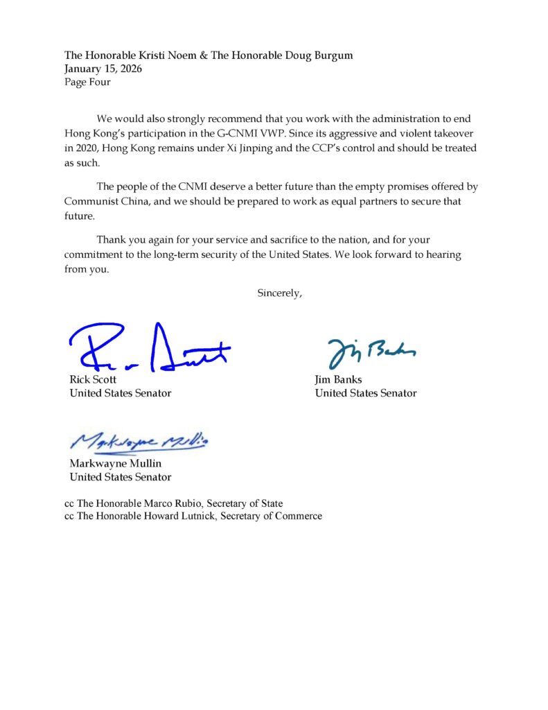 In a January 15 letter addressed to DHS Secretary Kristi Noem and Interior Secretary Doug Burgum, Senators Rick Scott, Jim Banks, and Markwayne Mullin called for the administration to end the CNMI Economic Vitality & Security Travel Authorization Program (EVS-TAP) and require a standard tourist visa for Chinese nationals visiting the CNMI.
