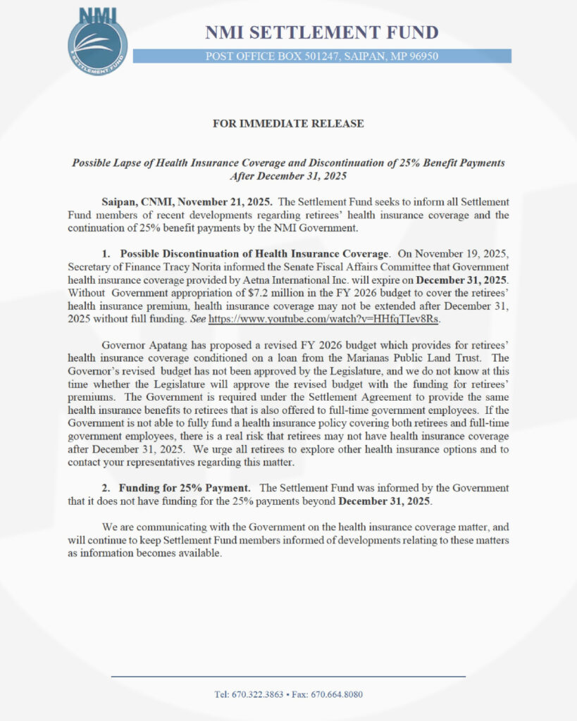 SAIPAN — The NMI Settlement Fund is warning retirees that their government-provided health insurance coverage and 25% benefit payments could stop after December 31, 2025, unless new funding is approved.
