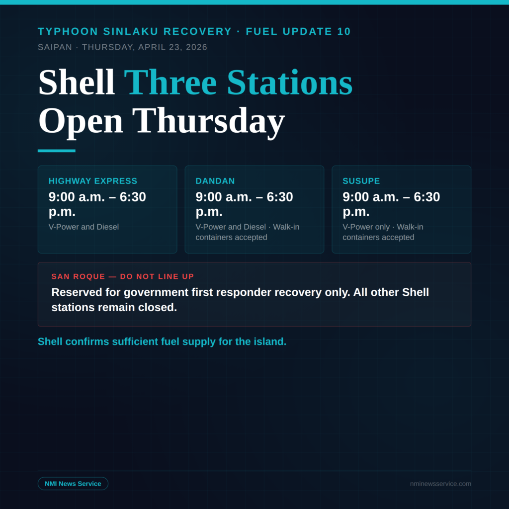 SAIPAN — Shell has three stations open on Saipan Thursday, April 23, from 9:00 a.m. to 6:30 p.m., according to Shell Station Typhoon Update No. 10 issued Wednesday afternoon.