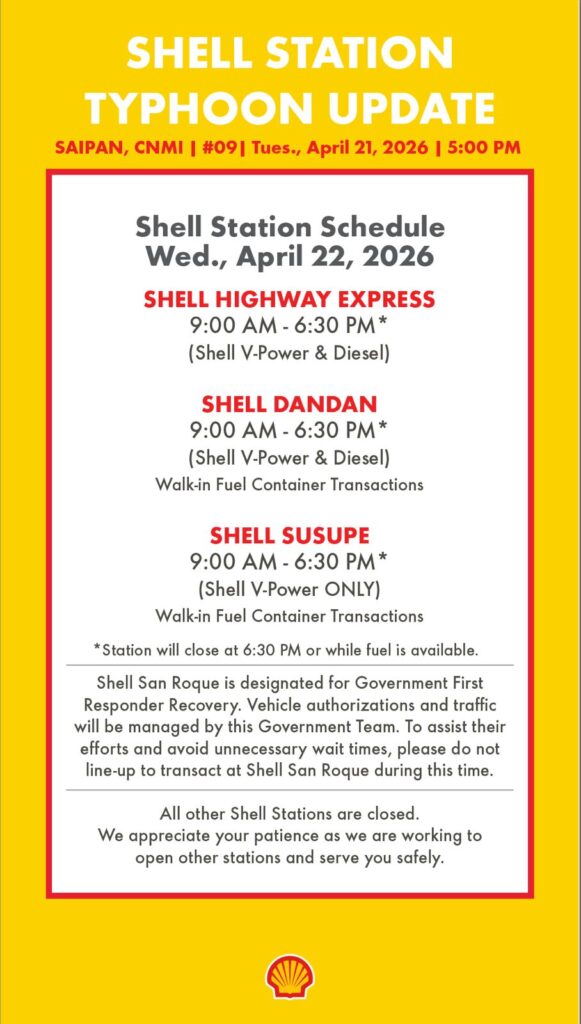 SAIPAN — Three Shell stations on Saipan will be open Wednesday, April 22 from 9:00 a.m. to 6:30 p.m. or while fuel is available, according to Shell Station Typhoon Update 9 issued Tuesday afternoon.
