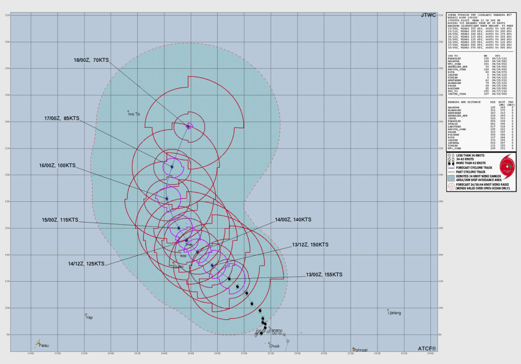 JTWC Warning 17, issued Monday, shows the storm’s maximum sustained winds decreasing from 155 knots at the time of issuance to 150 knots — approximately 173 mph — by Monday evening, and 140 knots by Tuesday morning at the point of closest approach to Saipan, Tinian and Rota. The storm is moving northwest at 8 knots, slightly slower than previous bulletins.