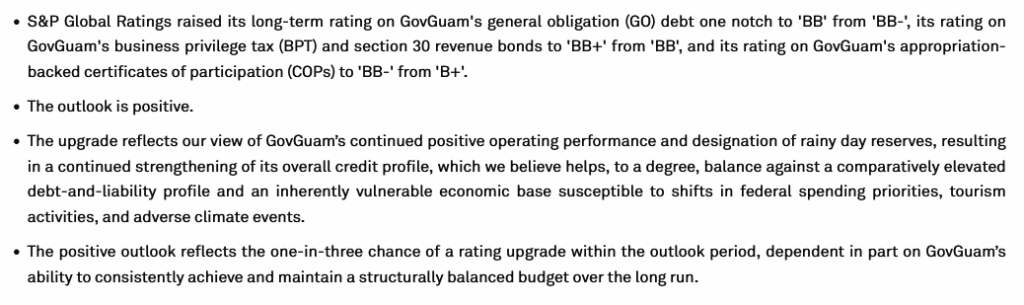 At the same time, S&P said further strengthening of budget reserves, sustained structural balance, and even modest improvement in Guam’s debt and liability profile could support another upward move if the island can continue to show resilience under changing conditions.