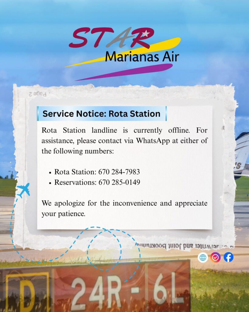 ROTA — Star Marianas Air advises that its Rota Station landline is currently offline following Typhoon Sinlaku. Passengers and those seeking reservations can reach the airline via WhatsApp at the following numbers: Rota Station at 670-284-7983 and Reservations at 670-285-0149.